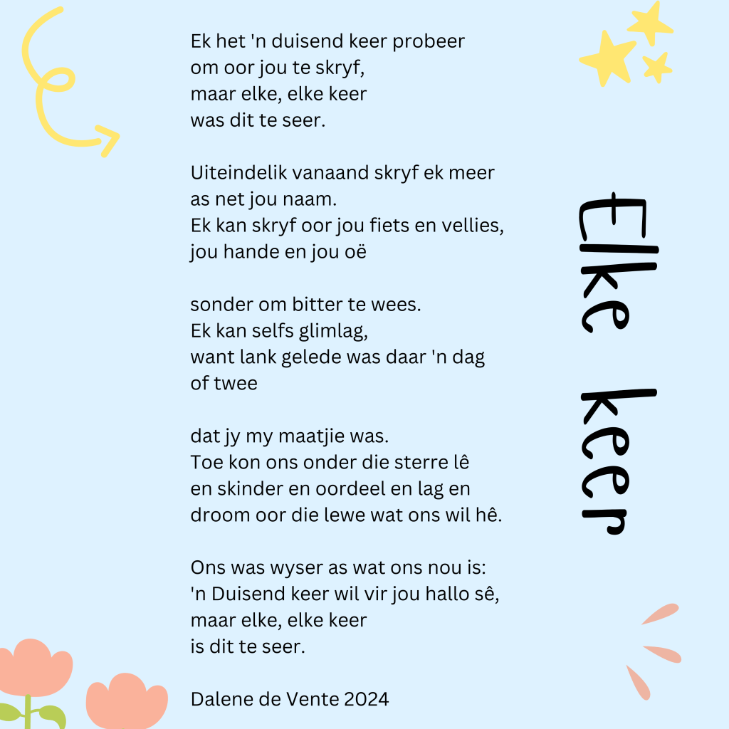 Ek kan skryf oor jou fiets en vellies,